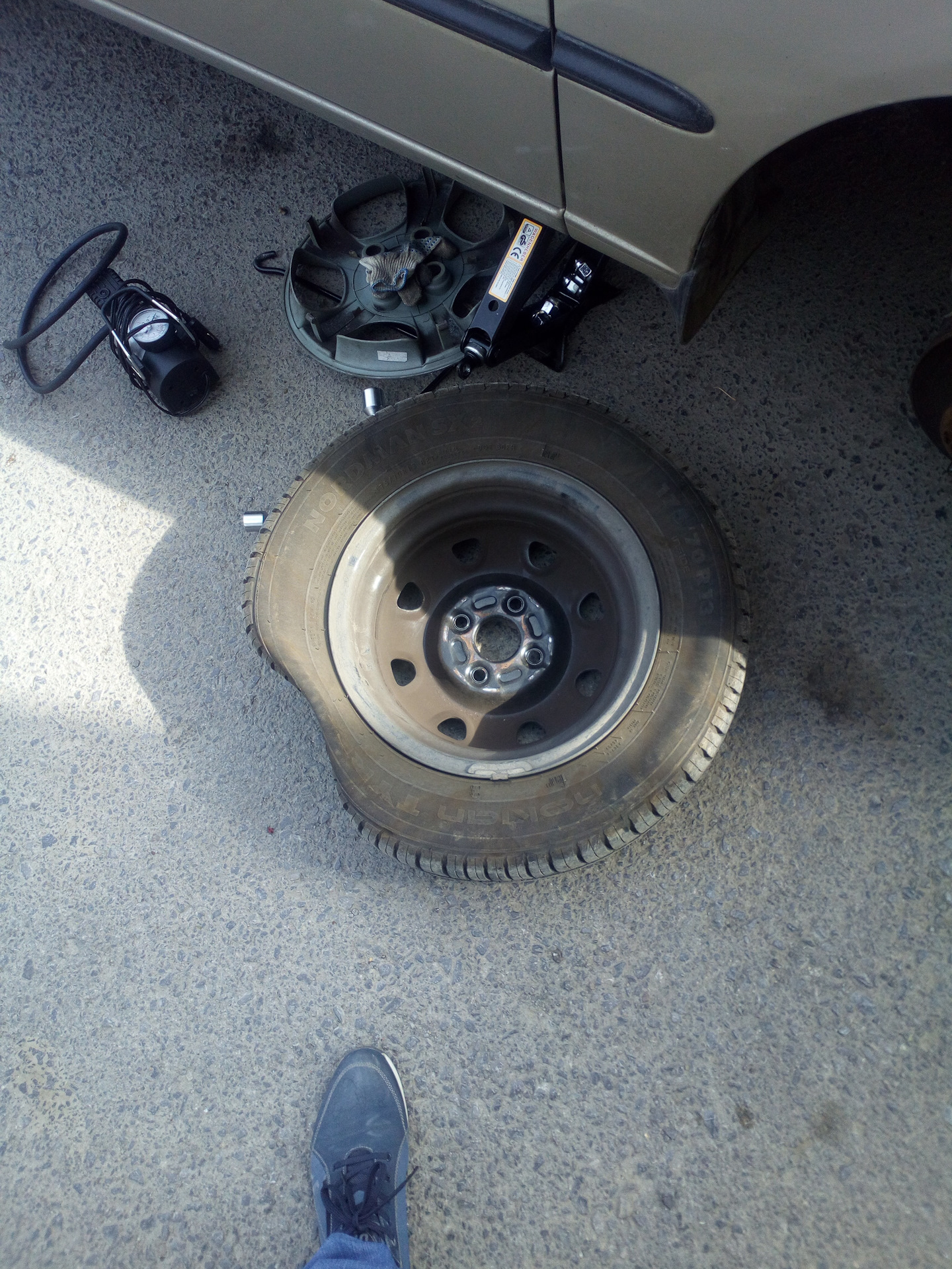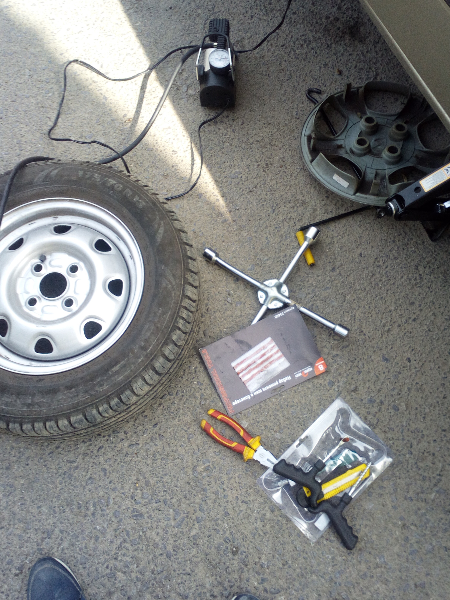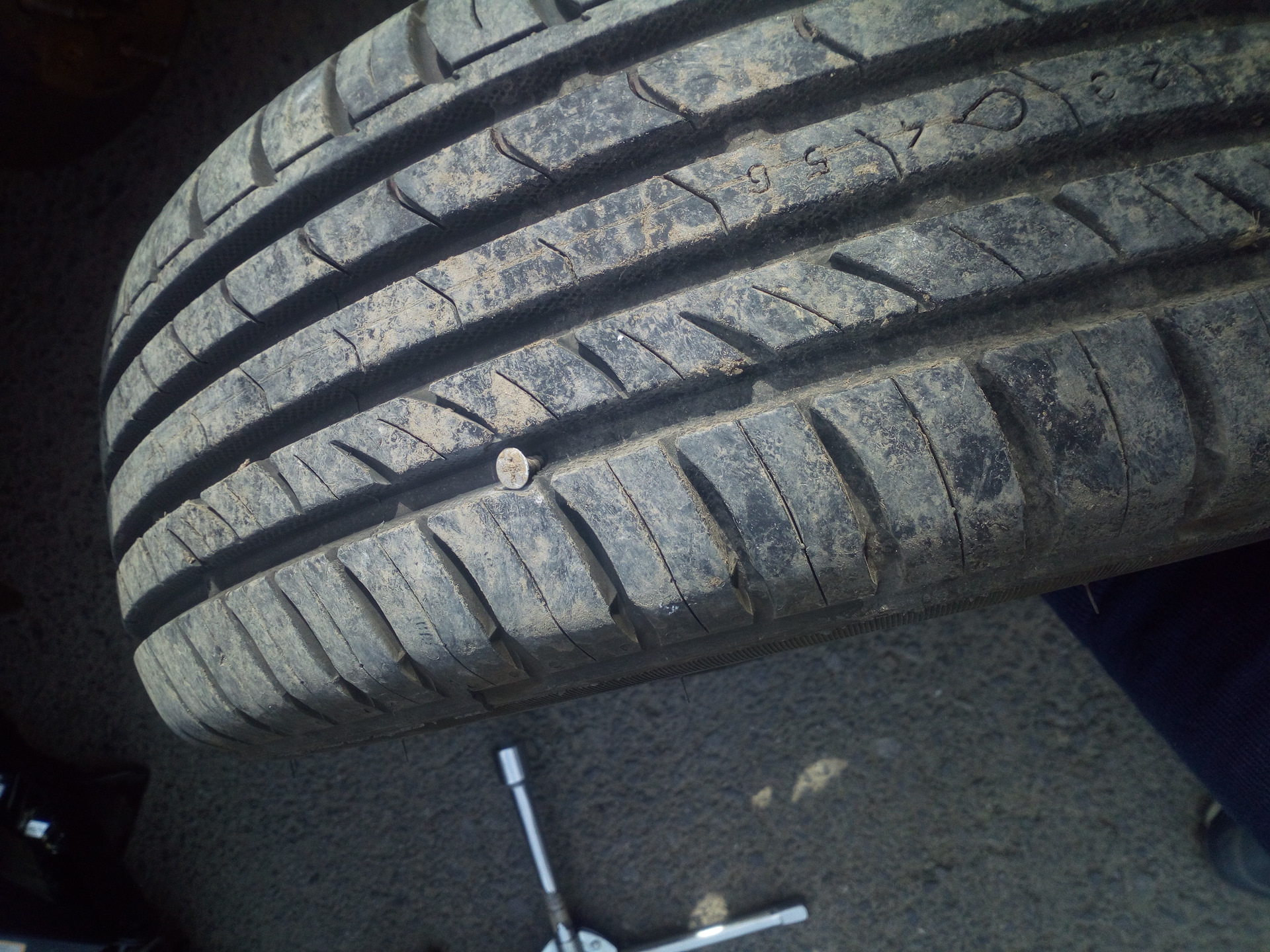 So, I'm getting ready for work, feeling cheerful. I came out, checked all the fluid levels as usual. Belt tension, and so on and so forth. I'm thinking it's time to hit the road, I look at the wheels. And I see a real bummer) Looks like I picked up a screw in front of the house yesterday (it wasn't screwed in deep, by the way — strange where I could have picked it up). Thankfully, I always have a repair kit in the car — so I got to try it out. In my inexperience, I pushed the first plug completely inside the tire) I seated the second plug properly. Before inserting each plug, I soaked it with the glue that came with the kit. A day has passed, seems to be holding pressure fine. Here are a few photos.