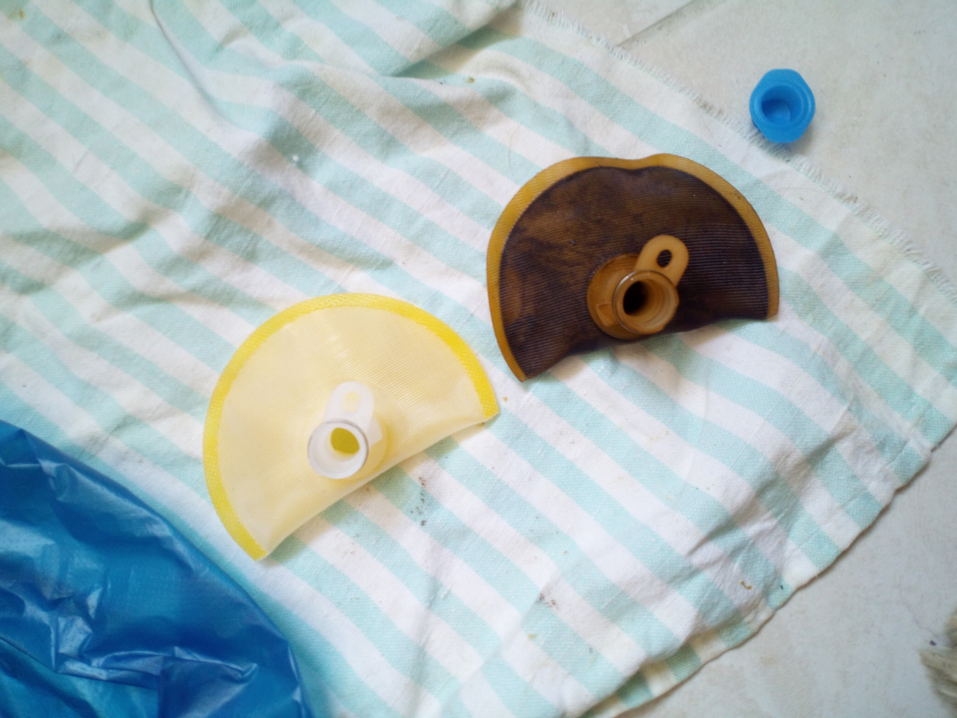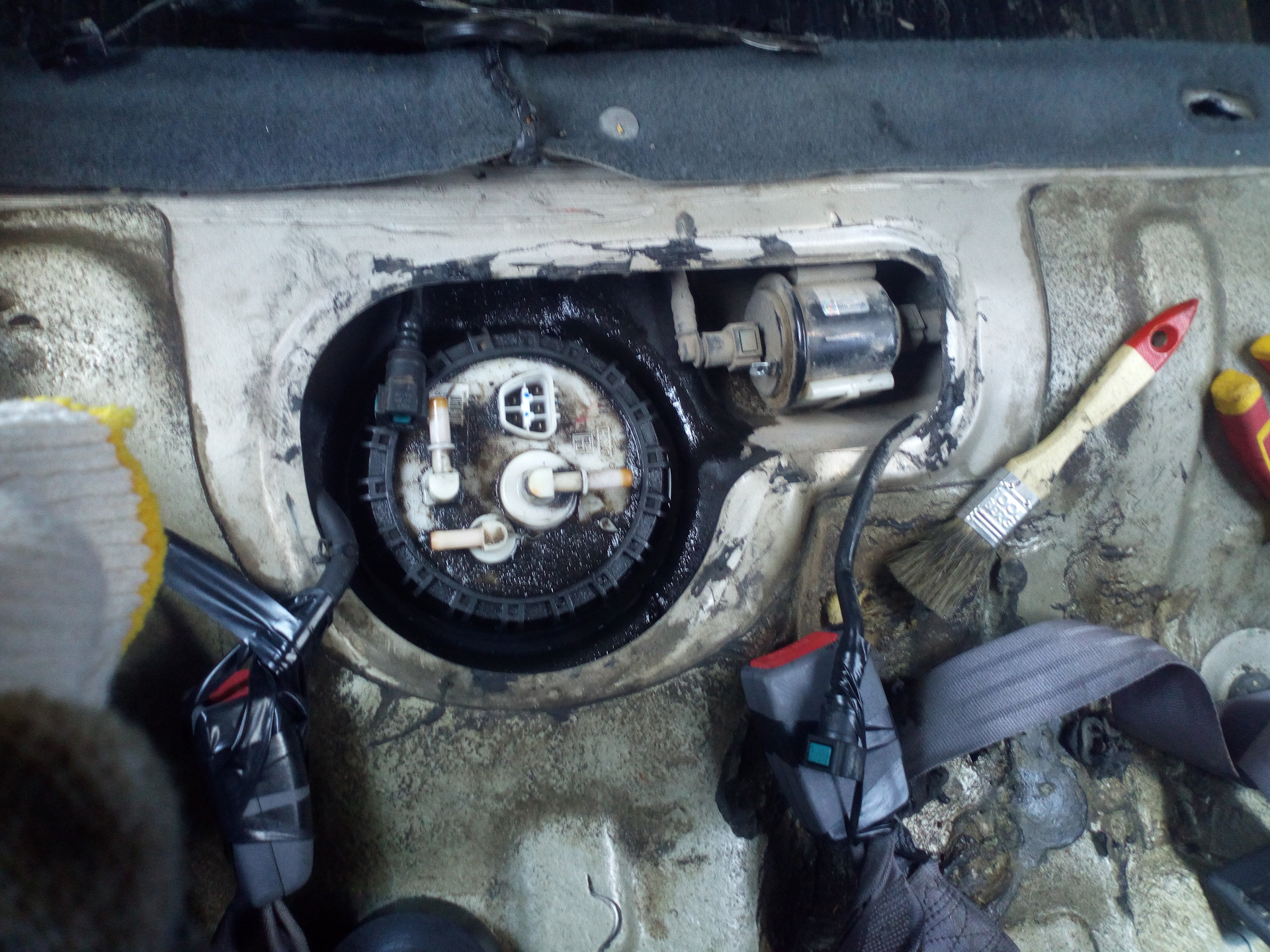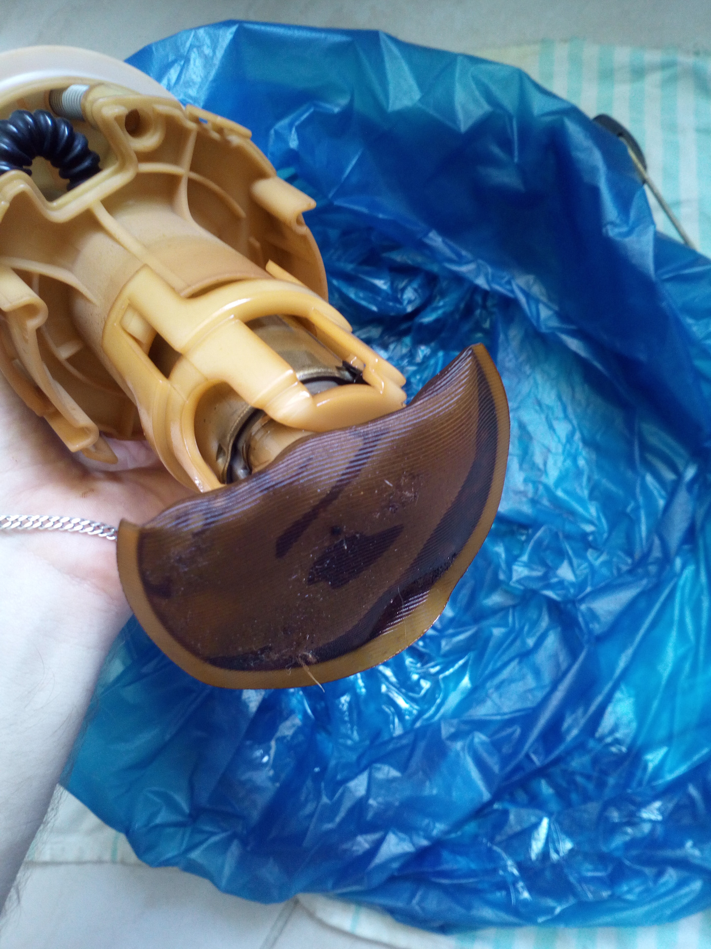 In the end, I bought an AMD fine filter, an original fuel pump strainer, a fuel pump O-ring, and sealant. Of course, installing the filters didn't go without a few hiccups. Here's what I decided for myself: first, always do fuel filter replacements in special gloves; personally, gasoline caused an unpleasant burning sensation on my fingers. Also, I didn't fully relieve the pressure in the fuel system, and as a result, I spilled a bit of gasoline — quite unpleasant, it stank for about two days afterwards. (As far as I understand, after removing the fuel pump relay, you need to crank the starter more). Well, here's another tip that I learned from a repair manual. It turns out that on the fine filter, there's a place for grounding (I understand it's to prevent a spark when removing the fuel lines). It says the ground wire should only be disconnected after you've removed the hoses. Dunno, I took it off first thing, and it seemed fine) maybe I just got lucky. But the problem I couldn't solve was fully securing the metal cover with sealant (I didn't have anything heavy enough to press it down while it set).