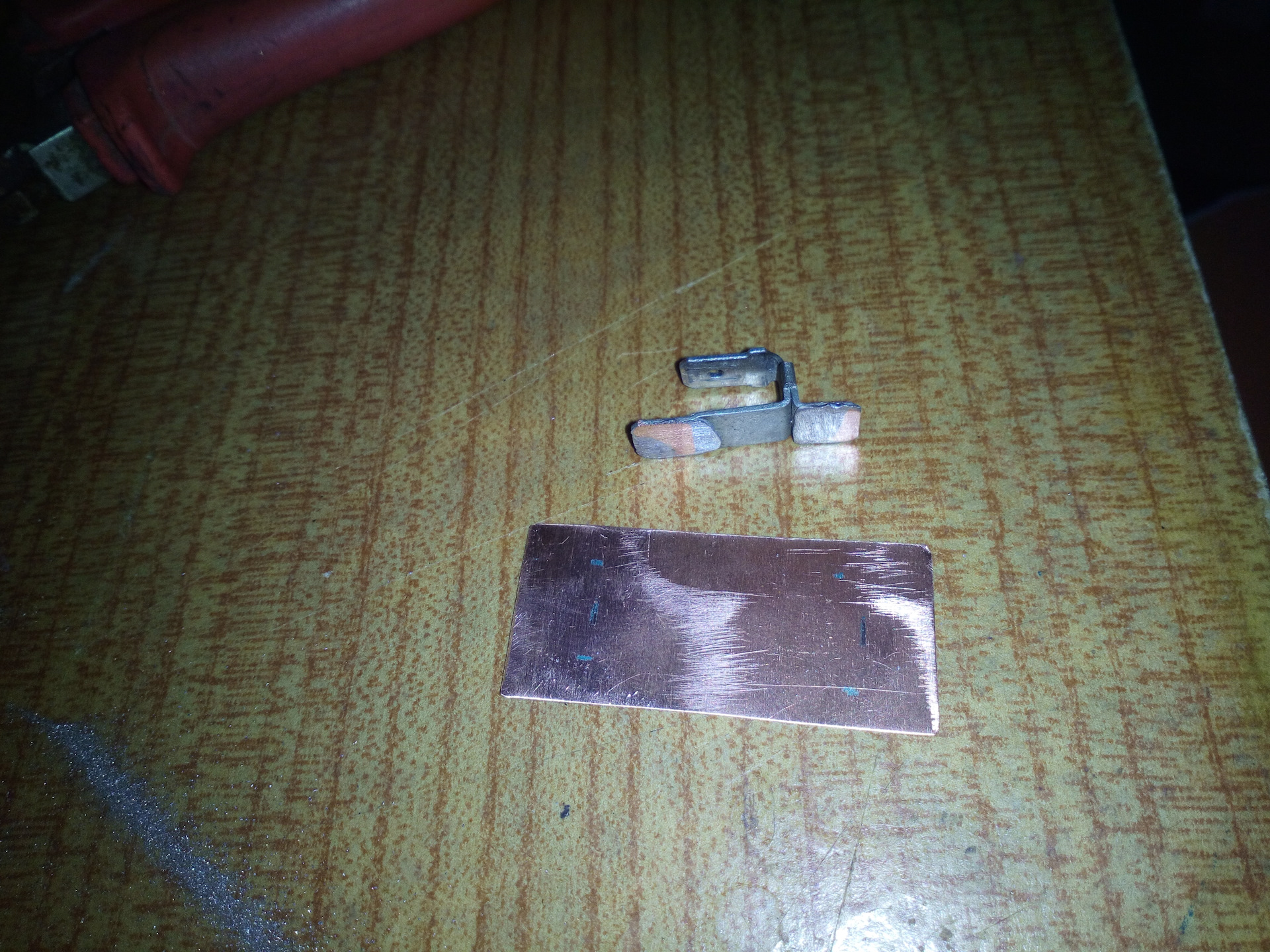 I decided to fix it like this: solder the detached contact to a copper plate, which I would then glue to the glass. Some people use low-melting-point solder and heat the glass — but I was afraid of heating the glass and soldering, especially since my soldering iron doesn't have temperature control. So, I bought a copper plate at the radio market (the nearest scrap metal shop didn't have the right plate, unfortunately, so I decided to buy one at the market — more expensive but faster), and cleaned the old solder off the terminal. I cleaned the contacts. This was my first time soldering, so my first attempt was a failure. I'll say right away, in my inexperience, I bought POS 40 solder, and that was a BIG mistake; it takes longer to melt, and instead of forming a proper mixture, it balls up. I guess everyone who does this probably knows that, but I fell for it. After soldering the terminal, I cleaned the area on the glass where I would be gluing with an eraser and decided to use conductive glue. The salesman really talked up this glue. The lack of any specifications on the packaging bothered me, but I decided to try it. Well, it's NOT EVEN glue! Just some watery stuff mixed with God knows what. It doesn't even make your fingers stick together. So, I HIGHLY ADVISE everyone against buying conductive glue in this kind of packaging. I'll have to look for another glue, or maybe try to make my own (mix graphite with regular Moment glue — but I'm not sure what the resistance would be like). Sorry, there won't be many photos.